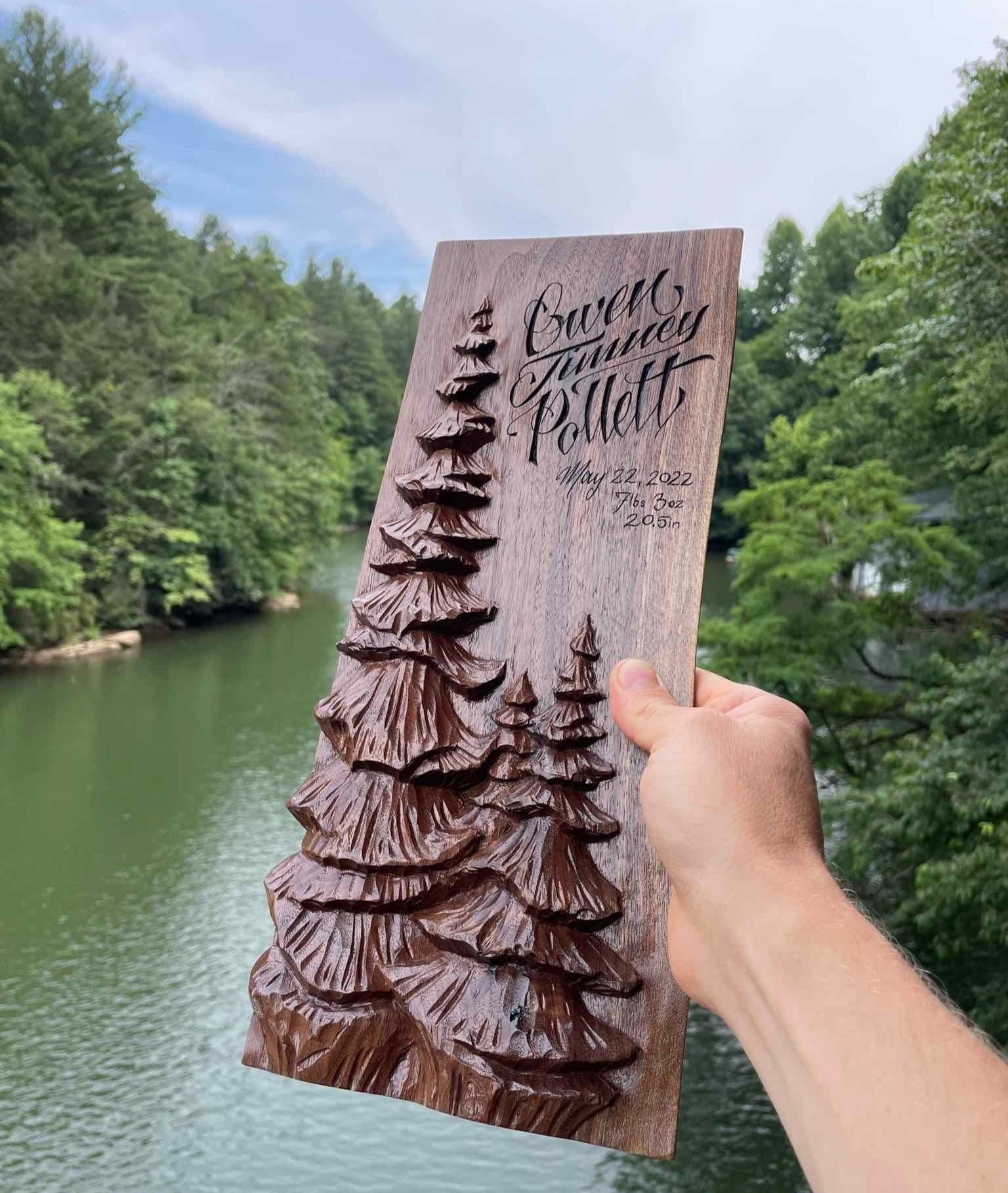 This relief carving was inspired by a larger pine tree carving I had created, so I was ‘warmed up’ on carving pines. Using a router to remove as much material as possible I then set out to show the detail possible with chisels and gouges. The piece of walnut I started with was quite thick and allowed me to keep this piece as one, solid board. I then used my skills in calligraphy to write and carve in the baby’s name. The baby’s room had a National Parks Theme.